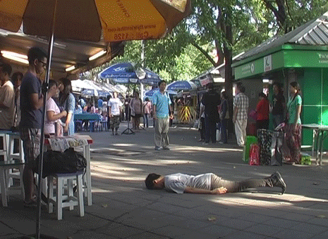 "Planking" is a documentation video of public intervention while people stop walking for national anthem at 8 o'clock in the morning and 6 o'clock in the evening.